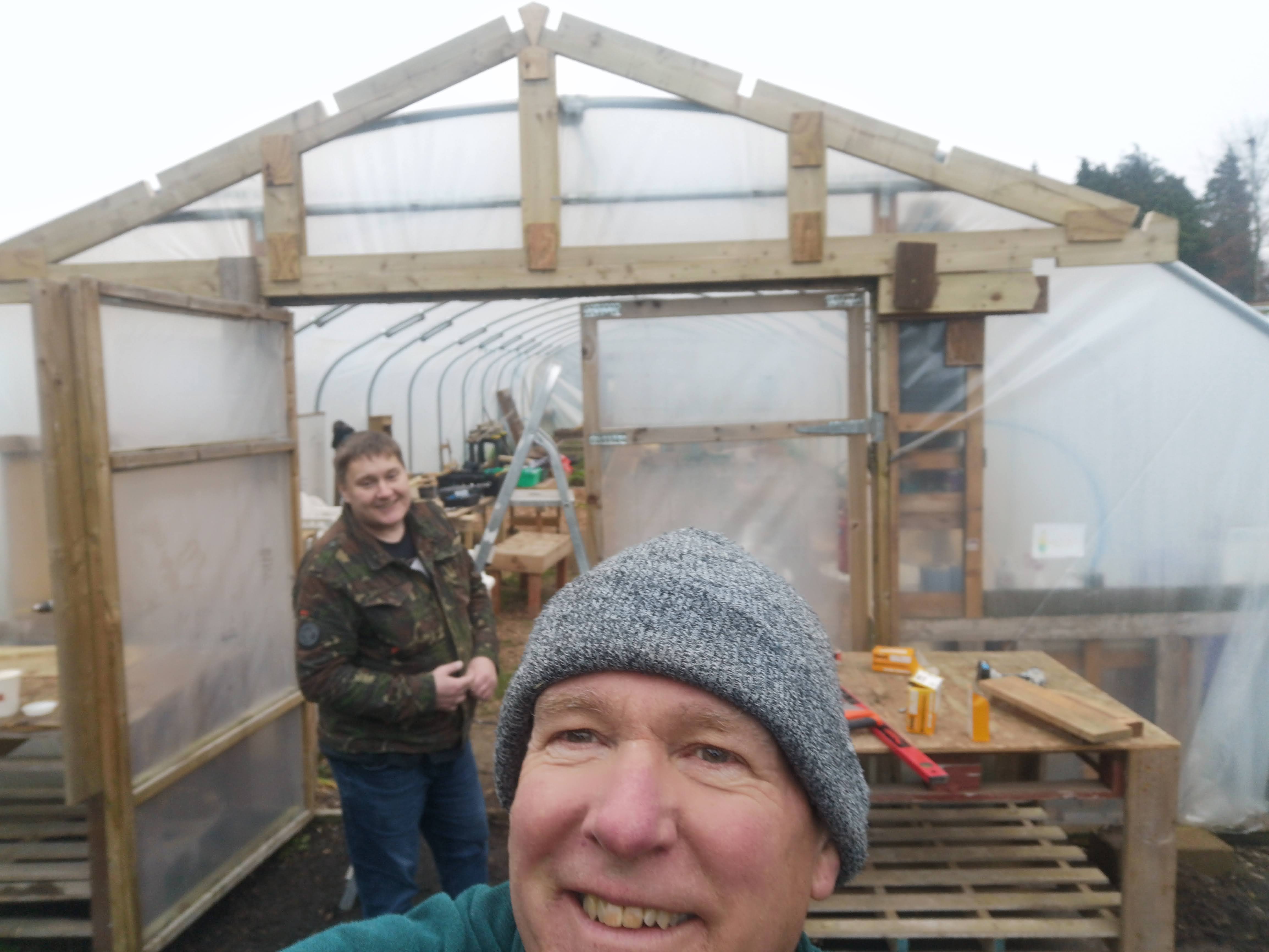 | We started making the trusses for it back last summer - very handy to have the huge open polytunnel space for working on full lengths of wood. Dean and Jess working away there... |